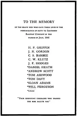 List of employees of the Southern Railway Company who were killed working during the 1916 flood in the Carolinas