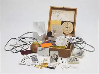 As Fluxus gradually became more famous, Maciunas' ambitions for the sale of cheap multiples grew. The second flux-anthology, the Fluxkit (late 1964),[76] collected together early 3D work made by the collective in a businessman's case, an idea borrowed directly from Duchamp's Boite en Valise[77][78] Within a year, plans for a new anthology, Fluxus 2, were in full swing to contain Flux films by John Cage and Yoko Ono (with hand held projectors provided), disrupted matchboxes and postcards by Ben Vautier, plastic food by Claes Oldenburg, FluxMedicine by Shigeko Kubota (containing empty pill packages), and artworks made of rocks, ink stamps, outdated travel tickets, undoable puzzles and a machine to facilitate humming.[79]