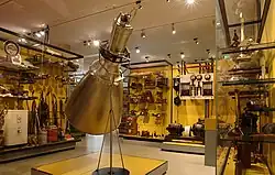 The 1964 building was modernised in 1996–98 and reopened with a new permanent exhibition on the history of Bremen, spanning over 1200 years from medieval archaeological finds to the rebuilding after the Second World War.[1] Exhibits include the head of the Bremen Roland, sandstone statues from Bremen Town Hall, cars by Borgward, machinery from the Koch & Bergfeld silverware company, models representing shipbuilding in the state in the 20th century, and also a curiosity: the Complimentarius, an automaton who used to greet people coming up the steps into the great hall of the Schütting.