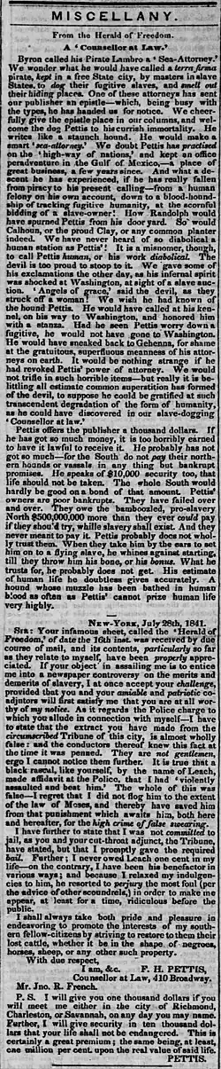 Abolitionist, newspaper editor, and future U.S. Representative John R. French takes the measure of Fontaine H. Pettis in his father-in-law's newspaper, Herald of Freedom (The Liberator, September 17, 1841)