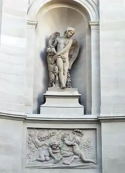 The decoration of the two wings of the building consisted of four niches with bas-relief figures representing "Les Genies des Seasons" (The spirit of the seasons): "by young people with wings carrying the fruits which appear in each season. The intention of this is to show that the abundance which reigns in Paris does not suffer any interruption during the course of the year.