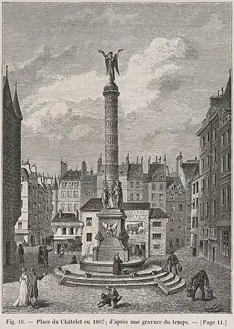 Around the base of the column are four statues representing Vigilance, Justice, Strength and Prudence, also made by Boizot. The lower basin of the fountain, designed by architect Gabriel Davioud, was added to the fountain in 1858 during the reign of Emperor Louis Napoleon when the Place du Châtelet was expanded and the fountain moved to its center during the renovations of Baron Haussmann.[3] At that time the base was also decorated with statues of Egyptian sphinxes spouting streams of water, sculpted by Henri Alfred Jacquemart.[4]