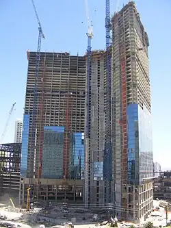 The bank group was led by Bank of America,[38] which began negotiating with Fontainebleau shortly after the lawsuit was filed.[39] Through a separate lending group,[38] the project had $130 million to continue construction while the lawsuit proceeded.[38] However, the second group partially pulled its financing in late April 2009, after the first group rescinded its loan on the project. Work was reduced to skeleton crews, and construction proceeded at a slower pace.[38][40] In May 2009, Fontainebleau filed an amendment to its lawsuit, stating that Deutsche Bank, part of the main banking group, had a conflict of interest. The bank had an ownership stake in the upcoming Cosmopolitan resort, also under construction on the Las Vegas Strip. Deutsche Bank was accused of "seeking to destroy the Fontainebleau in order to minimize competition" for the Cosmopolitan. The bank was to provide $80 million to the Fontainebleau.[41][42] The allegations against Deutsche Bank were eventually dropped.[43]