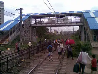Bridge at Tilak Nagar Station in Mumbai, with some people choosing to walk across the tracks