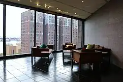 The elevators and one set of emergency stairs are on the western side of the building, near the northwest corner. Another set of emergency stairs are on the northeast corner. There are also emergency stairs within the diagonal piers on the eastern and southern sides of the building, at the ends of the northern and western wings respectively.[18][47] The Ford Foundation's library, which originally included 18,000 volumes, is located beneath the lobby.[27] The basement has a conference room and an auditorium,[27][69] the latter of which is decorated with a tapestry by Sheila Hicks.[70][50] There are 54,000 square feet (5,000 m2) of event space, as well as an art gallery and office space, all of which can be rented out.[50]