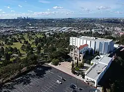 The Court of David at Forest Lawn-Glendale is located right before the Mystery of Life garden on Cathedral Drive and is centered around a seventeen-foot-tall replica statue of Michelangelo Buonarroti's David. The first Forest Lawn replica of David was installed at Forest Lawn on June 22, 1939.[5] The statue was placed using a series of ropes and pulleys. The statue fell due to seismic activity in 1971.[6] The head and right foot of the 1939 replica is on display at the Forest Lawn Museum. Later Forest Lawn copies fell in 1994 and 2020.[6] A new bronze replica of David was installed at Forest Lawn-Glendale in 2021.