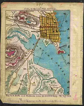 To remedy the situation, one of McClellan's first orders upon taking command was to greatly expand the defenses of Washington. At all points of the compass, forts and entrenchments would be constructed in sufficient strength to defeat any attack.[6] Alexandria, which contained the southern terminus of the Chesapeake and Ohio Canal and one of the largest ports in the Chesapeake Bay, was an object of "anxious study."[7]