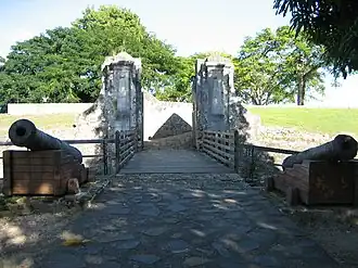 Fort Fleur d'épée is a fortification on Grande-Terre on Guadeloupe.[1] The origins of its name are unknown, though it may correspond to the nickname of a soldier who lived in it. It was built from 1750 to 1763 on a polygonal plan by Vauban in the heights above the town of Gosier, many metres above the bay. It is made up of underground rooms leading to small rooms. The powder magazine and kitchen with a furnace are still visible. Its spacious entrance hall now hosts temporary art exhibitions. It was captured by the British and then retaken by a French battalion under Victor Hugues which expelled the British from Guadeloupe on 3 June 1794.[2]