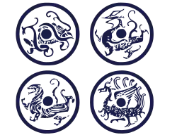Clockwise from top left: Black Tortoise of the North, Azure Dragon of the East, Vermilion Bird of the South and White Tiger of the West