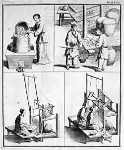 In China, silk-worm farming was originally restricted to women, and many women were employed in the silk-making industry.[65] Even as knowledge of silk production spread to the rest of the world, Song dynasty China was able to maintain near-monopoly on manufacture by large scale industrialization, through the two-person draw loom, commercialized mulberry cultivation, and a factory production.[66] The organization of silk weaving in 18th-century Chinese cities was compared with the putting-out system used in European textile industries between the 13th and 18th centuries. As the interregional silk trade grew, merchant houses began to organize manufacture to guarantee their supplies, providing silk to households for weaving as piece work.[67]