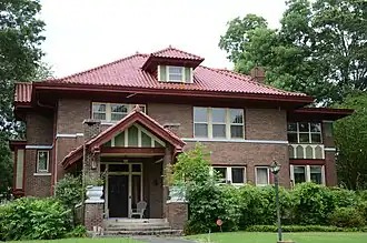 The Fox House is a historic house at 1303 South Olive Street in Pine Bluff, Arkansas. It is a two-story frame structure, its exterior finished in a variety of materials, with a tiled hip roof. The walls have a typical Craftsman-style variety of materials, including brick, stone, and stuccoed half-timbering. A gable-roofed entrance portico projects from the front, supported by brick piers and featuring extended eaves and large brackets. The house was designed by Theodore Sanders and built c. 1910.[2]