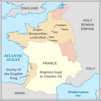 ![]() The Kingdom of France in 1190. The bright green area was controlled by the Angevin Empire. | |||||||||