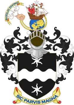 Drake's heraldic achievement and coat of arms contains the motto, Sic Parvis Magna, which means: "Great achievements from small beginnings".[111] A hand coming out of the clouds is labelled Auxilio Divino, which means "By divine aid".[113]