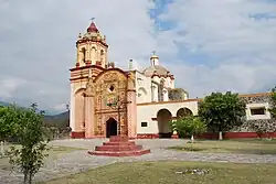 The pediment contains a large cross in relief of two styles related to the Franciscan and Dominican orders.[12][13] The main cross at the top represents redemption with the crosses of Calatrava and Jerusalem on either side. Indigenous elements are found in the church's interior, with an image of a jaguar and a person with Olmec features.[16][17] The bell tower is narrow and the baptistery is at the base of this tower. On the lower part appears a small window which illuminates the baptistery. The cupola of the tower is in a pyramid shape with a Baroque iron cross on top.[13]