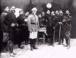 Photograph possibly taken moments before the battle of Arica. It depicts Bolognesi with his officer corps. It shows, among others, Lieutenant Colonel Ramón Zavala Suárez, on the far left, and Lieutenant Colonel Roque Sáenz Peña, on the far right. However, it is more likely that this photograph is of a theatrical representation staged at the end of the 19th century and that it was inspired by Juan Lepiani's painting entitled La respuesta.