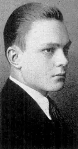 Black-and-white portrait photograph of a suited, smiling man with a pencil mustache. His dark hair is slicked back in a pompadour, with no sideburns.