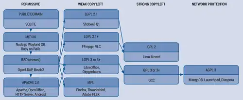 License compatibility between common FOSS software licenses according to David A. Wheeler (2007): the vector arrows denote a one directional compatibility, therefore better compatibility on the left side ("permissive licenses") than on the right side ("copyleft licenses").[46]
