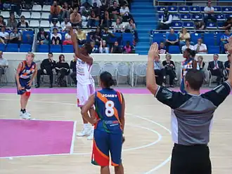 Leaving their designated places before the ball leaves the shooter's hands, or interfering with the ball, are violations. In addition, the shooter must release the ball within five seconds (ten seconds in the United States) and must not step on or over the free-throw line until the ball touches the hoop. Players are, however, permitted to jump while attempting the free throw, provided they do not leave the designated area at any point.[4] A violation by the shooter cancels the free throw; a violation by the defensive team results in a substitute free throw if the shooter missed; a violation by the offensive team or a shot that completely misses the hoop results in the loss of possession to the defensive team (only if it is on the last free throw).