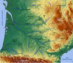 The French Great South-West includes all of the Aquitaine Basin and almost all of the Adour-Garonne Basin. On the hydrographic level, there are also certain tributaries of the Loire or the Rhône, and the basins of coastal rivers (Charente, Aude, Hérault, etc.).To the north, the Charentes are separated from Poitou by the Poitou threshold which is at the interface of the Aquitaine Basin and the Paris Basin.To the east, the seuil de Naurouze (or Lauragais) is located on the border of the departments of Haute-Garonne and Aude, on the watershed between the Atlantic Ocean and the Mediterranean Sea.