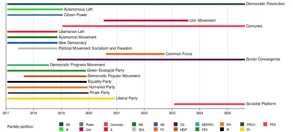 After the 2017 elections, a reorganization process took place among the members of the coalition: in January 2018, the Autonomist Movement (MA) began organizing convergences or mergers in order to become a new political party,[33] and on November 10, 2018, a meeting between the MA, Libertarian Left (IL), New Democracy (ND) and Socialism and Freedom (SOL) was held at the Huemul Theater, which led to the creation of the Social Convergence party in May 2019.[34] On the other hand, Autonomous Left (IA) and Citizen Power announced their merger on September 27, 2018, which materialized on January 20, 2019 with the launch of the Comunes party. In total, the Frente Amplio would be made up of seven parties and two political movements.[35][36]