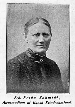 Frida Frederikke Caroline Christiane Schmidt (1849–1934) was a Danish teacher, suffragist and a pioneering activist for the Danish Women's Society on the island of Funen. She helped to establish the Odense branches of both the Women's Suffrage Association in 1889 and the Women's Society in 1890. In the early 1890s, she was one of the strongest advocates for having women's voting rights adopted as part of the Odense organization's programme, years before the Women's Society included the right to vote in their national programme in 1906.[1][2]