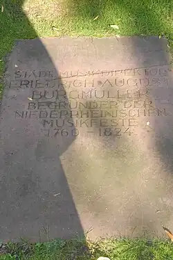 Half a year after his last festival leadership in Düsseldorf, 1822, he was dismissed for inexplicable reasons by the theatre directors Josef Derossi and Wolf, which led to severe financial losses for Burgmüller, as a result of which he fell seriously ill. He did not recover from this suffering and finally died on 21 August 1824 in Düsseldorf at the age of 64. He was buried at the Golzheimer Friedhof. After his death a benefit concert was organized in favour of his family. The people of Düsseldorf thanked him afterwards in 1949 for his merits with a new grave plate and the inscription: "Städtischer Musikdirektor Friedrich August Burgmüller, founder of the Niederrheinischen Musikfeste, 1760-1824". His two sons Friedrich Burgmüller and Norbert Burgmüller also became respected pianists and composers, with Norbert becoming the more talented and successful musician despite his short life and following in his father's footsteps. He also played an outstanding role in the Düsseldorf music scene.