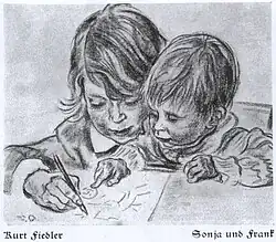 During World War I Fiedler was a front-line soldier in France. He learned French in self-study and became a translator. After 1920 Fiedler and his family took a flat in the culturally important Dürerbundhaus in Blasewitz. Here, Ferdinand Avenarius headed the leading[3] cultural organization of all German speaking countries at that time, the Dürerbund. In this surrounding Kurt Fiedler immediately made essential contacts. He designed the masthead for the social democratic newspaper Dresdner Volkszeitung.[4]