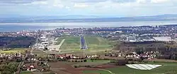 Aerial view of Friedrichshafen Airport with Lake Constance in the background