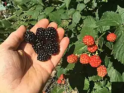 The pistils of the raspberry are called drupelets because each pistil is like a small drupe attached to the receptacle. In some bramble fruits, such as blackberry, the receptacle, an accessory part, elongates and then develops as part of the fruit, making the blackberry an aggregate-accessory fruit.[26] The strawberry is also an aggregate-accessory fruit, of which the seeds are contained in the achenes.[27] Notably in all these examples, the fruit develops from a single flower, with numerous pistils.