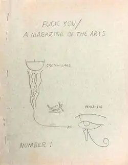 Fuck You/ A Magazine of the Arts was a literary magazine founded in 1962 by the poet Ed Sanders[1] on the Lower East Side of New York City. Sanders later co-founded the musical group the Fugs. Sanders produced thirteen issues of Fuck You/ A Magazine of the Arts from 1962 to 1965.[2]