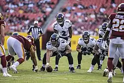 Some contemporary NFL teams have even used converted or hybrid linemen as their primary fullbacks. Examples of such players during the 2024 season include Los Angeles Chargers defensive end Scott Matlock, who started his NFL career as a full-time lineman and he started playing on both sides of the ball under head coach Jim Harbaugh.[7] Another example is Baltimore Ravens defensive tackle Patrick Ricard who played his first two seasons on both offense and defense.[8] Also, the Chicago Bears center Doug Kramer Jr. often played fullback that season.[9]