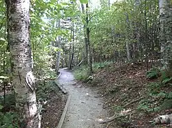 Park amenities include a golf course, a heated saltwater swimming pool, three campgrounds, and a network of over 100 km (62 mi) of hiking and biking trails.[2] There are 25 hiking trails throughout the park. The Caribou Plains trail and boardwalk provides access to upland forest and bog habitats.[3] Dickson Falls is the most popular trail in the park. During the winter, Fundy National Park is available for day use, at one's own risk. Visitors use the park to go cross-country skiing, snowshoeing, tobogganing, and winter walking. The cross-country ski trails are groomed by the local Chignecto Ski Club.