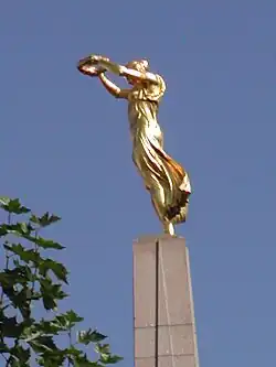 The centrepiece of the monument is a 21-metre-tall granite obelisk. Atop of the obelisk stands a gilded bronze statue representing Nike, the Greek goddess of victory, or "Queen of Freedom" (Friddenskinnigin in Luxembourgish),[1] holding out a laurel wreath as if placing it upon the head of the nation. At the foot of the obelisk are two (ungilded) bronze figures, representing those Luxembourgish soldiers that volunteered to serve for France; one lies at the base of the statue, having died in service of his country, whilst the other sits, mourning his dead compatriot.