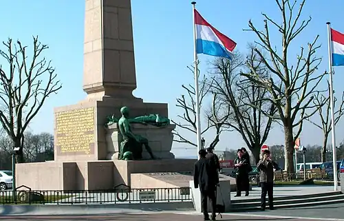 The Monument of Remembrance (French: Monument du souvenir), usually known by the nickname of the Gëlle Fra (Luxembourgish for 'Golden Lady'), is a war memorial in Luxembourg City. It is dedicated to the thousands of Luxembourgers who volunteered for service in the armed forces of the Allied Powers during both World Wars and the Korean War as well as the Luxembourgers who volunteered in the International Brigades during the Spanish Civil War.