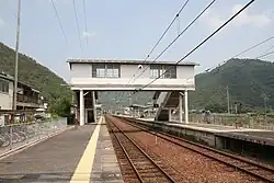 The station consists of a ground-level side platform and an island platforms connected to the wooden station building by a footbridge. The station is unattended.