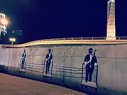 In August 2018, for the 10 years of occupation Gagosh made another anti-occupational mural on the wall of National Parliamentary Library of Georgia named “Wall of August”. The mural is based on the Guernica, prominent work of Picasso as it was created for the response to the bombing of Guernica by Nazi's. “The Wall of August” depicts several tragic themes that were shot during the war days of 2008. The mural conveys several metaphorical elements such as Russian military boots on the Georgian ornamented carpet, bear enters and leaves, the theme and bombs that repetitively contain the digits of 2,0,0,8.[26][27] [28][29]