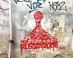 During the 2018 World Cup in Russia, anti-occupation stencil signed by Gagosh emerged in Tbilisi Old Town. The stencil presents the red FIFA cup placed upon red skulls with text in the bottom “Russia 2008”. On his official website, the author writes: “10 years before Russia2018, the world witnessed the Russia2008 away match in Georgia, played by artillery and troops with disregard for fair play. And still they have not been disqualified?!”[24][25]