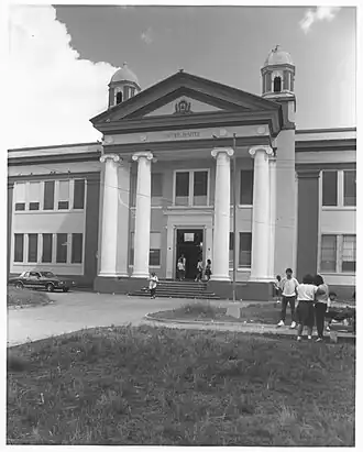 It is a U-shaped, two-story concrete structure with Classical Revival elements including monumental portico with triangular pediment and use of columns.[3]