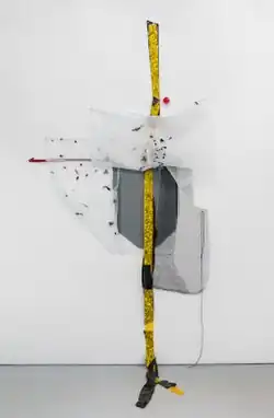 Penn's more self-contained, individual works have been called constructed or three-dimensional "drawings in space."[3][1][33] Her "Splink" (2006), "Scribble" (2006–11) and "Blackfil" (2007–10) series consisted of episodes of contrast—blots of black and dark gray paint, torn plastic bag, filament and graphite squiggles—flaring up against whitish fields of wall or translucent materials.[3][4] Critic Peter Frank wrote of this work, "There is a naturality to Penn's 'installed drawings' that suggests such drawings have appeared, and continue to metamorphose, organically, as if rendered by aesthetically driven spiders or mold spores."[6][4] In the "Polyglot" series (2013-17), Penn shifted to layered, planar forms of folded, crumpled and punctured lenticular plastic and translucent Yupo paper.[38] The "Stele" series (2020) featured cruciform arrangements, ethereal materials and shadows, and a sharp verticality suggesting figural presences.[9][2]