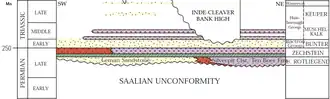 During this era the end of extensional tectonics had been well constrained in the southern North Sea basin; the extension occurred from the late Carboniferous to the Triassic.[2] There had been some reactivation of Varsican basement faults due to the subsidence of the Sole Pit Basin and allowing basin tilts creating a peripheral graben system around the basin.[1] Due to the reactivation of the basement faults it led to the beginning of halokinesis in the basin.[3] The halokinesis allowed major uplift during the Mesozoic because of the presence of salt and the reactivation of basement faults; the thrusting permitted the sediment to thrust over the diapirs and float on top of the Zechstein salt.[5] Due to the Kimmerian phase uplift in the northern portion of the North Sea, it allowed subsidence and deposition to fill the basin, creating sandstone. Due to differential loading along the faults, salt diapirs developed and played a huge role in the southern North Sea basin and all salt tectonic structures.[5] Reverse faulting associated with late Carboniferous basin inversion is recorded by a wide range of Carboniferous stratigraphy subcropping the Permian sediments. The subcrop pattern indicates a strong influence of NW–SE tectonic trends during this inversion. This inversion event was followed by deposition of upper Carboniferous red beds, which pass up into sands of the Permian Rotliegend Group; these are overlain by evaporites of the Zechstein Supergroup.[1] A major phase of basin inversion during or at the end of the Late Cretaceous affected many basins in northwestern Europe, including the Sole Pit Basin and the Cleveland Basin, and has been attributed to strike-slip reactivation of basement faults.[3]