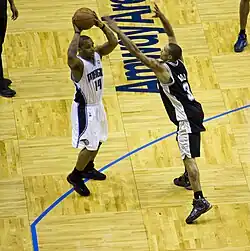 At the Utah Revue, Hill led his team by averaging 12.9 points over four games; however he continued to struggle offensively with his shooting, only making 21.4% of his three-point field goals.[16] In the first of the four games, Hill led all scorers with 21 points and helped the Spurs defeat the Utah Jazz, 82–57. He followed up with a quiet offensive performance, 6 points, in a win against the NBDL Ambassadors, before scoring 18 points in a loss versus the Gerald Green-led Mavericks. In the final game of the Revue, Hill once again struggled with his shooting (1–7) but managed to make key plays with the game on the line. Hill made two clutch free throws with 6.9 seconds left and then forced a turnover on the defensive end to beat the previously undefeated Atlanta Hawks.[17][18]