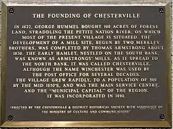 The Merkley brothers drowned while transporting supplies upriver and Hummel soon sold the land to Thomas Armstrong and his son who, in 1828, erected a sawmill and grist mill.[7] The mills attracted many further settlers, and by 1838 the small settlement founded by Hummel and Armstrong had grown and was known as Armstrong's Mills or Hummelville. In 1845 a post office was established under the name of Winchester, but in 1875 the village was renamed Chesterville.[8] Much of the land Hummel initially purchased was eventually sold off to pioneering settlers, often for a low price, and the land on which the Chesterville Community Hall currently stands was once sold by him for a "single barrel of whiskey".