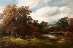 After Eliza's death in 1900, he moved to Kirk Ireton and later married fellow artist Kate Stevens Smith (1871-1964) - they set up home in Idridgehay where he died in 1910. His son William Lakin Turner (1867-1936) also became a landscape oil painter.[3]