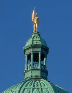 Life-sized gilded statue of George Vancouver on the British Columbia Legislative Buildings in Victoria, British Columbia