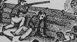 As the U.S. Army column marched northward through Central Florida, it was ambushed by the Seminole Indians on December 28, 1835, an ambush that would later be known as the Dade battle. During the first volley of fire from the Seminoles, Major Francis Dade and the majority of the U.S. troops were killed. The Seminoles erroneously believed that they had killed all of the U.S. troops in the initial ambush, and temporarily returned to their encampment.[5] However, a few dozen soldiers managed to survive the initial ambush, and Captain Gardiner was the highest-ranking officer among them. Gardiner used this lull in the fighting to order his men to build a small triangular stockade, and for them to bring their six-pounder cannon to defend it. The Seminoles soon returned to the battlefield and attacked the remaining U.S. troops, who had positioned themselves in the stockade with their cannon. As they were being fired upon again by the Seminoles, Gardiner attempted to rally his men by standing up and swinging his artillery sword in the air while yelling orders at them.[5] Whenever the Seminoles shot down the soldiers manning the cannon, Gardiner would order a new group of his soldiers to take their place and to keep firing the cannon. Because Gardiner's men were under intense rifle fire from the Seminole Indians, they were unable to properly aim the cannon, and most of the cannon shots were fired harmlessly up into the trees without hitting anyone.[5] Captain Gardiner was eventually killed after being shot 6 times by the Seminoles, and the remaining U.S. troops were then killed as well.