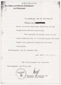On 28 March 1940, Werner Blankenburg of the Kanzlei des Führers der NSDAP (KdF) wrote to Major Gerhard Engel, Hitler's army adjutant, noting the problems for morale caused by the treatment of "half-Jews" and "quarter-Jews" while on leave, and the consequent risks associated with their having accessing to military secrets, proposing the exclusion of "half-Jews" from the Wehrmacht.[14] On 8 April 1940, Hitler issued a secret directive to the Wehrmacht instructing it to immediately purge all "half-Jews" and soldiers married to "half-Jews" other than in special cases.[6] "Half-Jews" could be granted various dispensations enabling them simply to remain in the Wehrmacht; to remain and be promoted; or to remain, be promoted, and be entitled to declare themselves "of German blood".[20] "Quarter-Jews" and soldiers married to "quarter-Jews" were permitted to remain[6] but were prohibited from serving as non-commissioned officers.[21] Some personnel duly turned themselves in; on one occasion, a commanding officer summarily executed a Jewish soldier, "infuriated at having his ranks sullied". Some commanding officers ignored the directive.[22] Enforcement varied across the Wehrmarcht; the decree was entirely ignored in the Afrika Korps, while implementation was postponed in the Kriegsmarine.[23] Some personnel of Jewish descent falsified papers and concealed their circumcisions.[24] In September 1940, the Oberkommando des Heeres (OKH) stated that "again and again cases have come to the attention of the OKH in which Jewish Mischlinge of the first degree (50%) or soldiers married to such Jewish Mischlinge are still in active military service in violation of the [8 April 1940] order" and insisted that all active personnel sign a declaration relating to their racial status.[6] It is estimated that tens of thousands of personnel of Jewish descent remained in the Wehrmacht following the directive.[6]