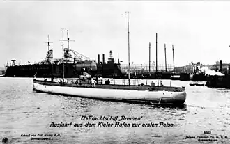 Bremen was built together with her sister ship Deutschland in 1916 for Deutsche Ozean-Reederei, a private shipping company created for the purpose, a subsidiary company of the North German Lloyd shipping company (now Hapag-Lloyd) and Deutsche Bank.[1] She was constructed without armaments, with a wide beam to provide space for cargo. The cargo capacity was 700 tons (much of it outside the pressure hull), relatively small compared to surface ships.