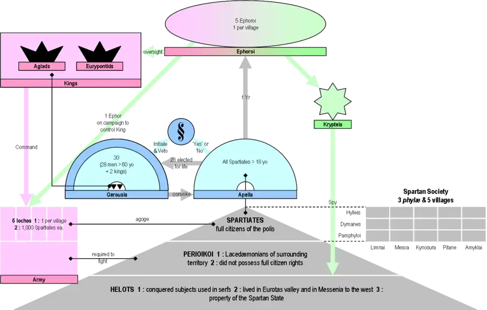 - ^ Cartledge, Agesilaos, pp. 18, 122 ("so it is probably safest to assert only that in practice, de facto rather than de iure, the Gerontes were drawn from a restricted social group").