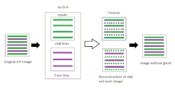 Reference free EPI ghost correction algorithm[3] uses a method called ALOHA (Annihilating filter-based low rank Hankel structured matrix completion approach). The data of the k-space matrix is numbered consecutively and is split into odd and even data based on the samples of the index. This method was developed based on the fact that the difference between the odd and even virtual k-space data is the Fourier transform of the underlying sparse image. It is based on the principle that Ghost Nyquists are produced due to the inconsistencies between the odd and even echos of the MR images. The occurrence of the Ghosts in the images is converted into missing k-space data and is recovered with the help of the ALOHA matrix.