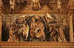 The most representative of Martini's wooden altars is that in Mortegliano,[3] which he completed in 1526. For this impressive work he was paid the enormous sum for the time of 1180 ducats. The altar, which stands more than five meters high and is the largest in Friuli, consists of 60 statues. It is divided into registers and subdivided into individual cells, as previously, but it has a spatial continuity through the columns of the architectural framework, as can be seen for example linking the Pietà group and the Dormitio Virginis. It is regarded not only as the artist's masterpiece, but also as one of the highest expressions of wooden sculpture of the Renaissance.